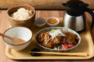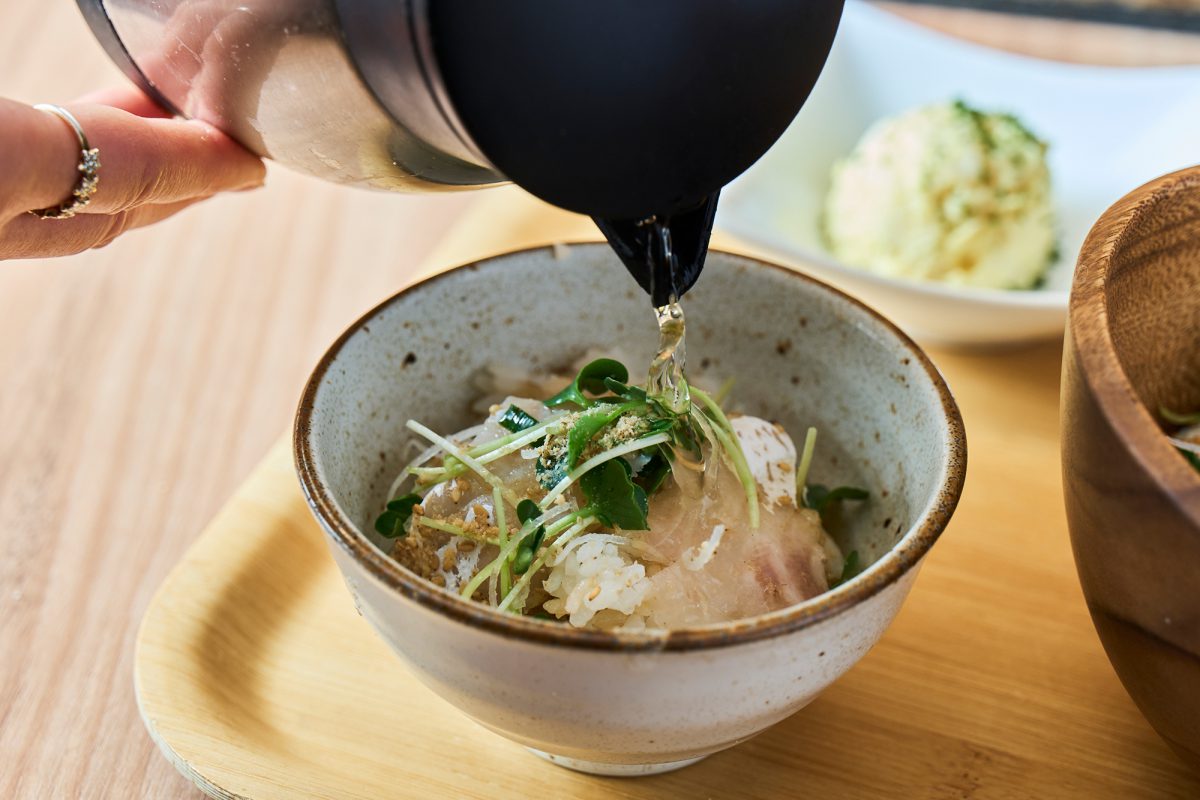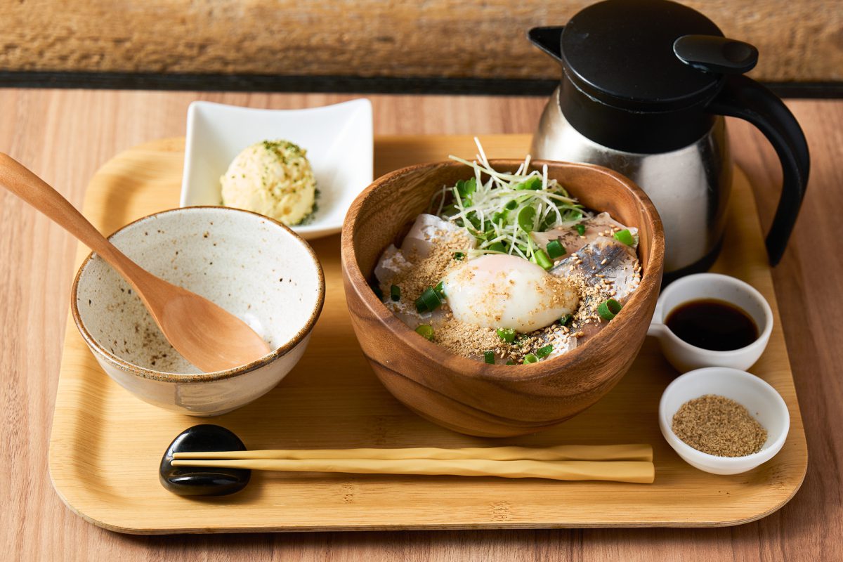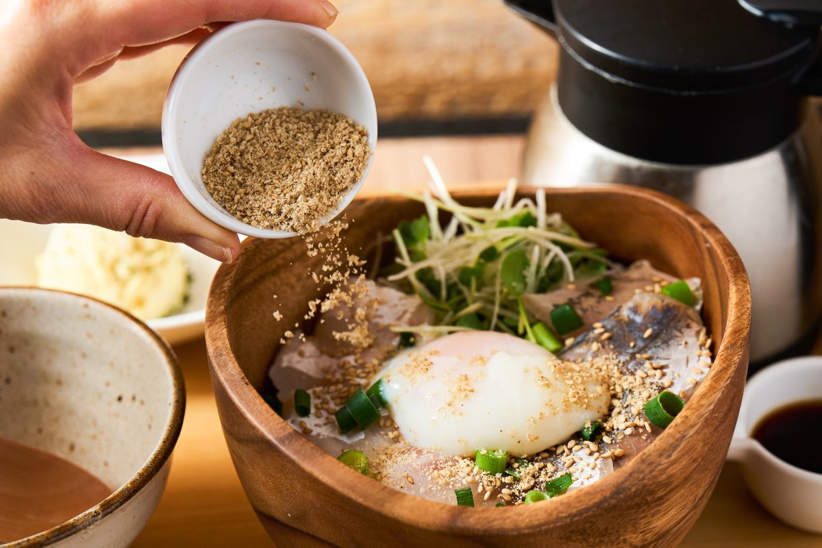 1度で2度楽しめる、創作だし茶漬け専門店のこめらくでは、ちょい足しのアレンジをご紹介。人気メニュー「鯛とあじの漁師ごはん」に追加ですりごまをプラスしたブラッシュアップアレンジ。通常の状態でごまはトッピングされているが、すりごまをかけるたび、ごまの香りが格段にアップ。たっぷりとかけてタレを絡めて召し上がれ。また、あまり知られていない、「豚の生姜焼き膳」のタレをニンニク醤油で焼いてくれる隠しアレンジも食べてみる価値あり。