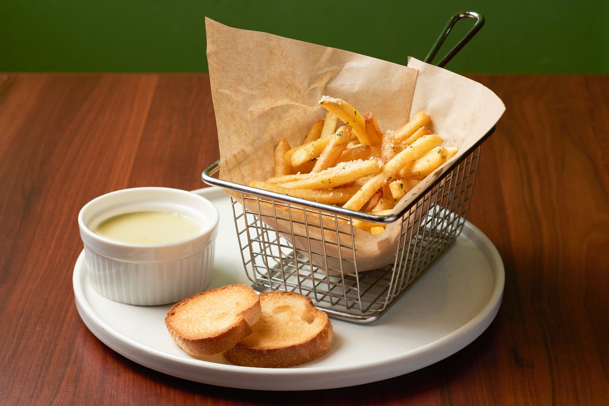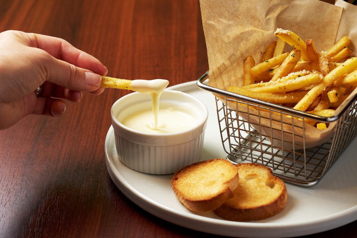 チーズ好き必見!デリ食べ放題ランチとメイン料理を楽しむ洋食屋での人気メニュー「ハーブポテトフライ」の通な、ブラッシュアップメニュー。通常“トリュフ香るディップ”が付け合わせだが、プラス275円で、看板メニューのハンバーグで使用されるチーズソースとバゲットスライスに変更可能。チーズソースはしっかりとしたチーズの香りはするものの、しつこくなく、あっさりとした味わいなので、ポテトフライなどの揚げ物にもベストマッチ。