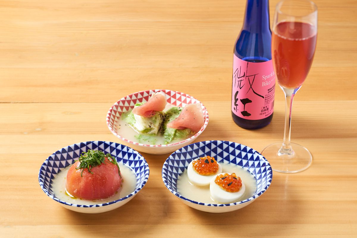 鶏白湯スープを使用した創作おでんが楽しめる〈ベジ串 創作おでん ぬる燗佐藤〉。春の乾杯にピッタリなお酒は、赤色酵母を使用した純米酒を本場のシャンパンと同じように、瓶内二次発酵したスパークリング日本酒の「微紅」。甘さが抑えられた、ドライな味わいは、「濃厚鶏白湯おでん」との相性もブラッシュアップ!野菜のうまみが活きたこだわりおでんと、キメの細かいスパークリングのマリアージュがたまらない。