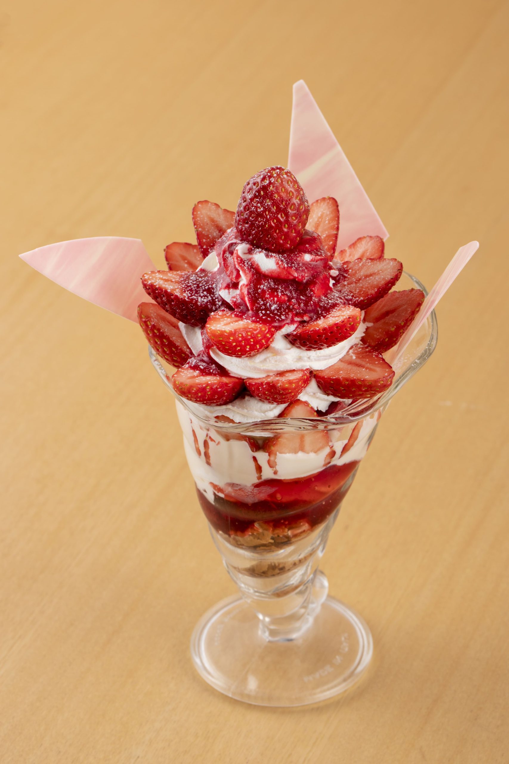 ⽢酸っぱいいちごを6個分贅沢にトッピングしたパフェ。濃厚なアイスと芳醇な純⽣クリームが⽢いいちごとマッチします。