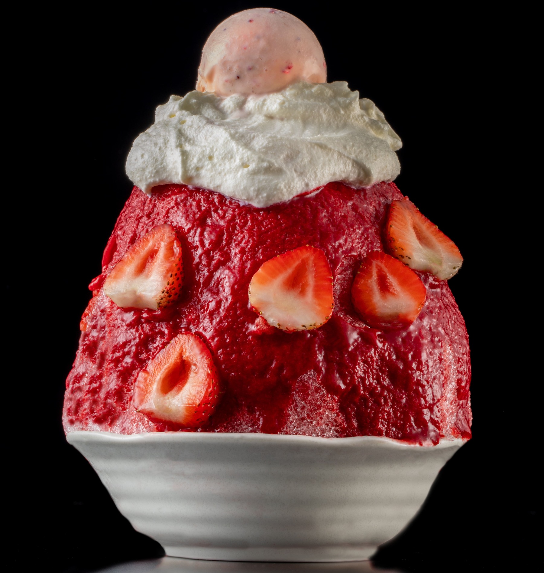 濃厚ないちごソースとふんわり軽い⽣クリームをのせたいちごクリーム氷。ショートケーキをイメージしており、⾒た⽬もインパクト抜群の氷の中には、伊勢抹茶のソフトクリームが⼊っています。