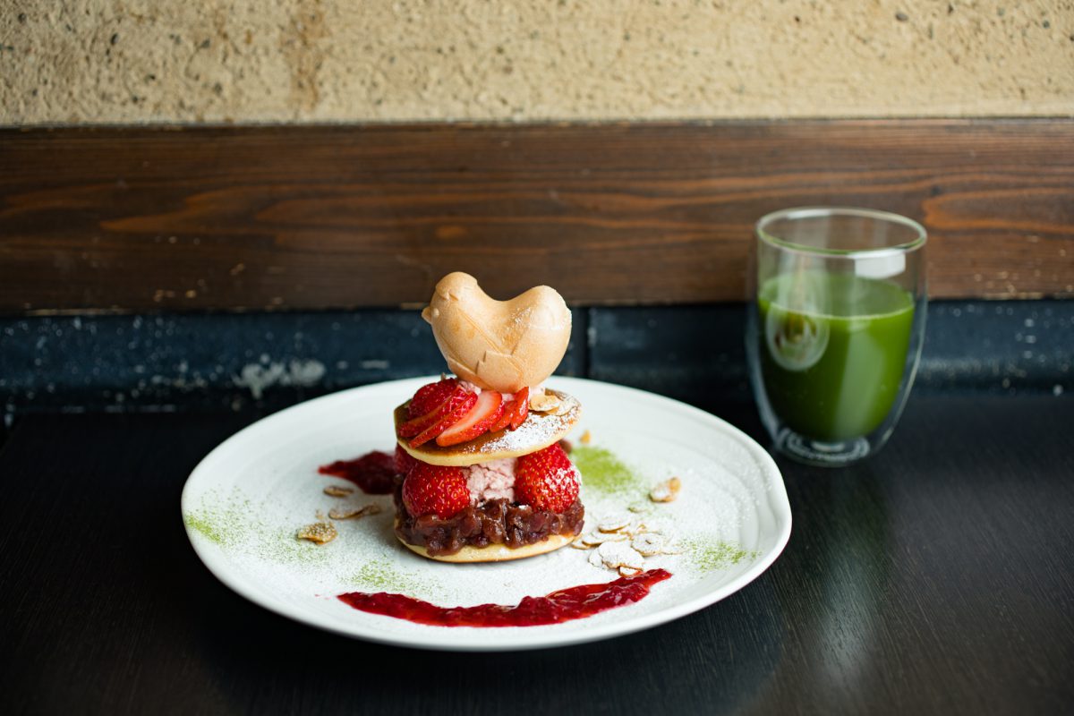 鉄板焼きの名店は、カフェメニューも秀逸。あんみつやおだんごなど和スイーツにこだわったラインナップだが、今年2月に「いちごあんバターどら焼き」が仲間入り。鉄板で温めたどら焼きの皮で、フレッシュないちご、自家製いちごバター、いちごピューレ、あんこなどをサンド。さらにいちごソースや抹茶などでデコレーションをほどこし、トップに鎮座するひよこ型のモナカの中にもいちごやバニラアイスが入るという、アイディア満載の一品。イチゴの甘酸っぱさを生かした新作は、3月末までの限定。