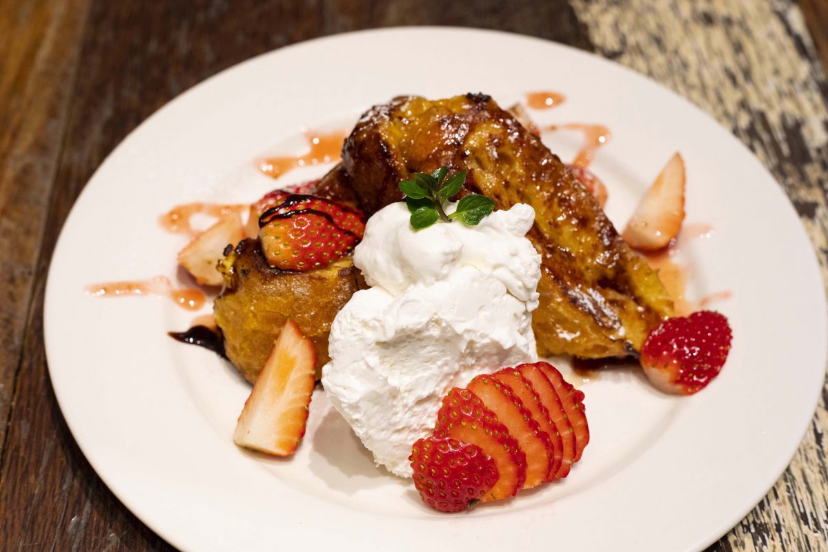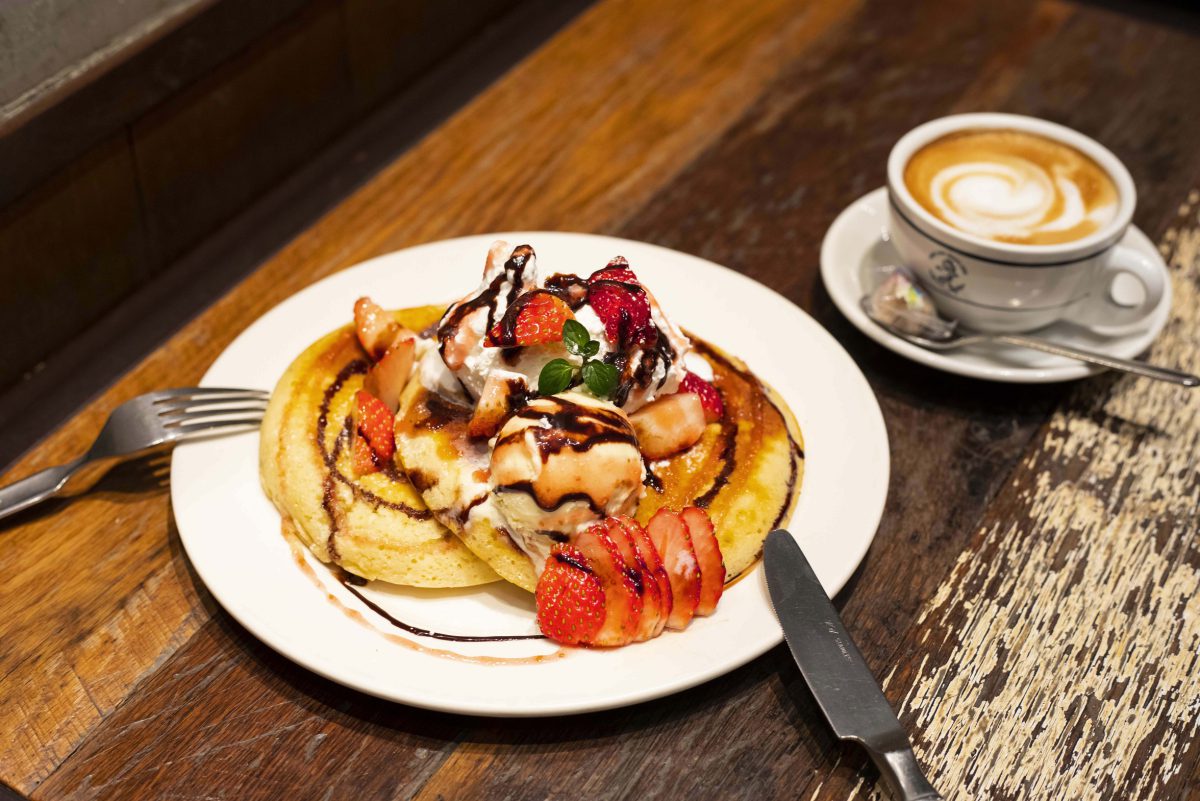 ハンバーグなどのグリル料理をメインに供するアメリカンダイナー。こちらのスイーツメニューは、グリル料理に負けないぐらいボリューム満点! 今季お目見えした「ストロベリーチョコレートパンケーキ」は、フレッシュないちご、バニラアイス、ホイップクリームのほか、チョコレートといちごのソースでデコレーションされ、見た目も華やか。注文が入ってから丁寧に焼き上げるパンケーキは、外側カリッ、中ふんわりの食感がたまらない。パンケーキの枚数は、1枚or 2枚から選べる。*パンケーキは2022年3月末まで提供。