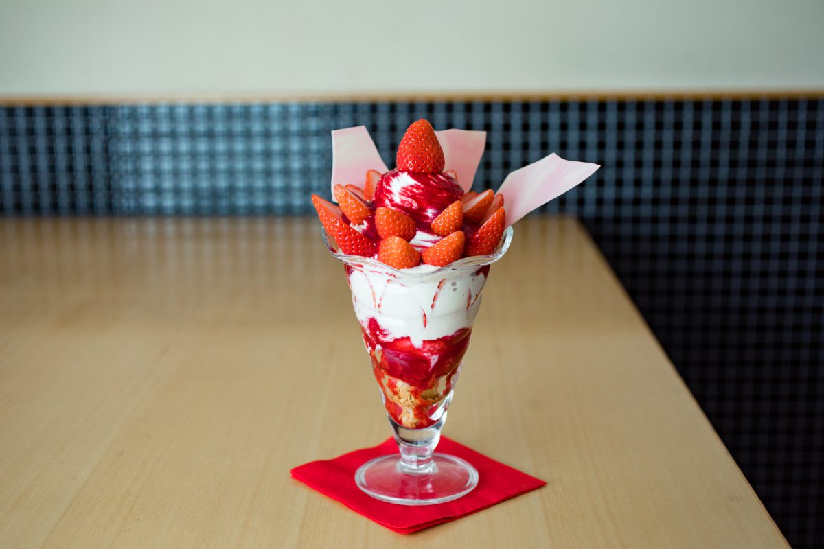 三重県津市で120年続く老舗和菓子屋〈伯藤久庵〉の4代目で、スイーツコンサルタントとして活躍する井端久泰さんがプロデュース。「いちご氷」や「苺ミルフィーユ」など、いちご尽くしのメニューが揃うが、その中でも「苺パフェ」はひときわ人気の品。10粒以上のイチゴをトッピングし、軽い食感のエスプーマ生クリームやアイスクリーム、イチゴのチョコレートなどを重ね合わせた芸術品。イチゴの甘酸っぱさと、生クリームやアイスの甘さが口の中で一体となり、儚くとろけていく。