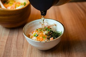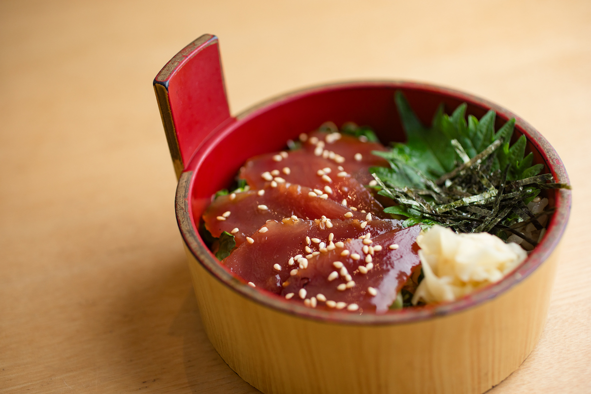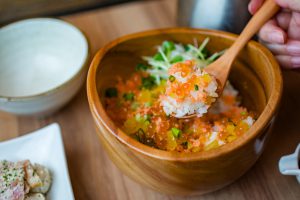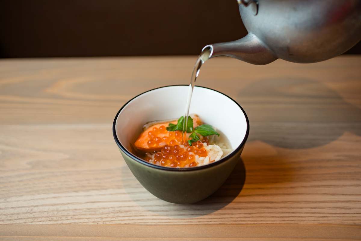 割烹や料亭の味をカジュアルに楽しめる和食料理店。看板メニューは羽釜ごはん。常時3種類用意し、注文が入ってから20分かけてお出汁でふっくらと炊き上げる。その羽釜ごはんに、脂ののった銀鮭と海の宝石と呼ばれているいくらを合わせた「鮭といくらの羽釜ごはん」は、開店以来多くのお客さんが注文する華やかな一品。炊き立てをそのままいただいた後は、こだわりの出汁をかけて海鮮茶漬けに。銀鮭のジューシーな脂が出汁に溶け出し、お箸が止まらない!