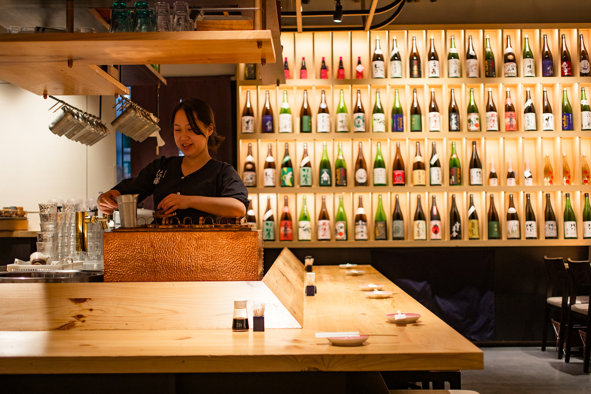 日本酒の新しい飲み方を提案しながら、酒に合う料理でもてなす1軒。全国各地から仕入れる約50種類の日本酒を揃え、0~55度まで11段階からお好みの温度が選べるのが特徴。 ディナータイムの看板メニューはおでんとベジ串だが、ランチタイムも和食の職人が丹精込めて作るすき焼、天丼、焼き魚などの御膳が楽しめる。なかでも「コスパ最強!」とリピーターが続出しているのが、一人前の鉄鍋で提供される「すき焼き御膳」。独自の製法で作り上げた秘伝の自家製割り下が、様々な食材の味わいを引き立てる。