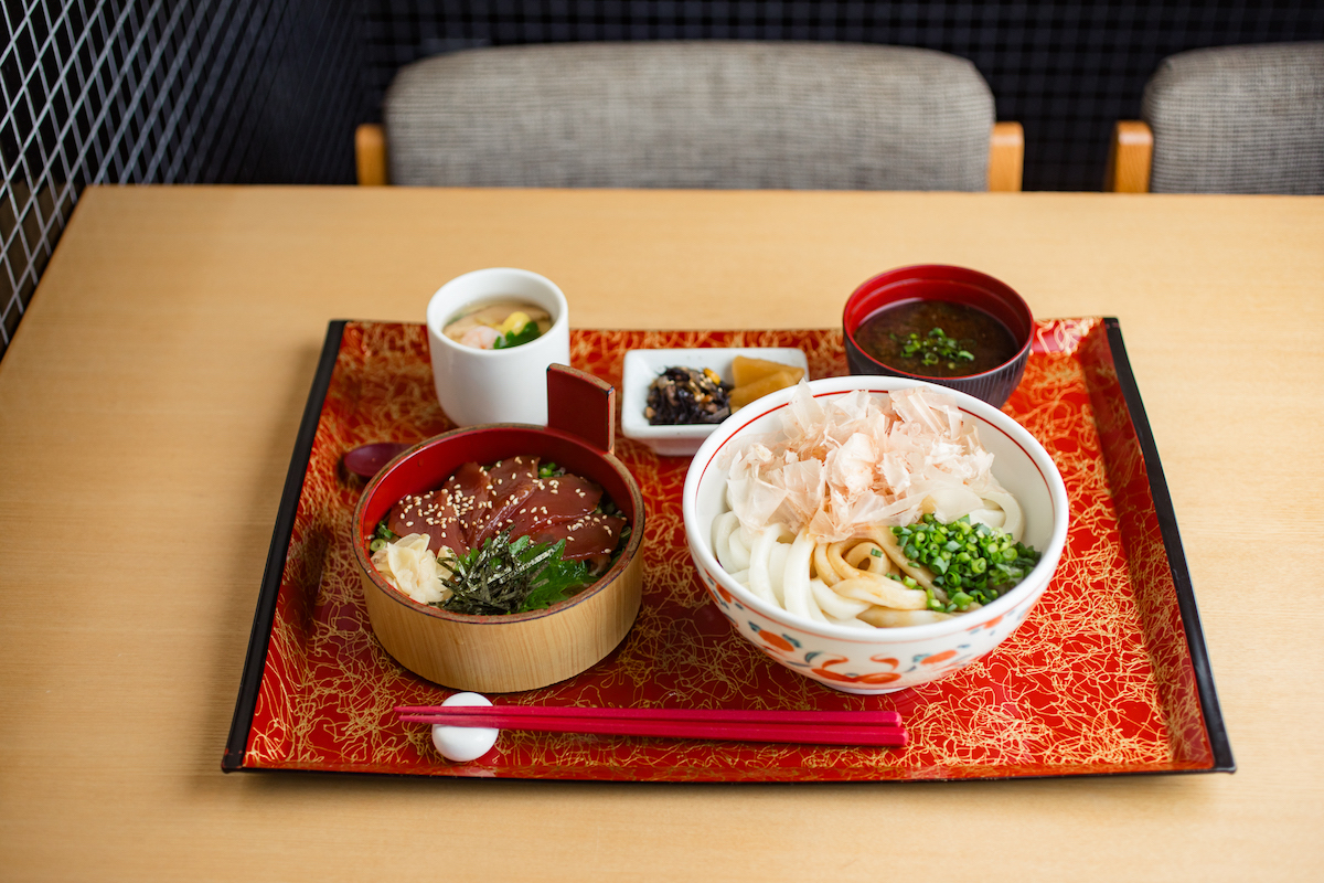 「伊勢のおもてなし」をテーマに、伊勢の名物料理を中心に、伝統料理から伊勢食材を活かしたアレンジ料理までをラインナップ。その中で人気が高いのが「伊勢うどん」。伊勢うどんは、江戸時代以前より伊勢地域の農民が、うどんに地味噌からできた「たまり」を少しかけて食べたのが始まり。たまり醤油に鰹節などをブレンドした黒い濃厚なタレに、太くて柔らかい麺が特徴のうどんをからめて召し上がれ。