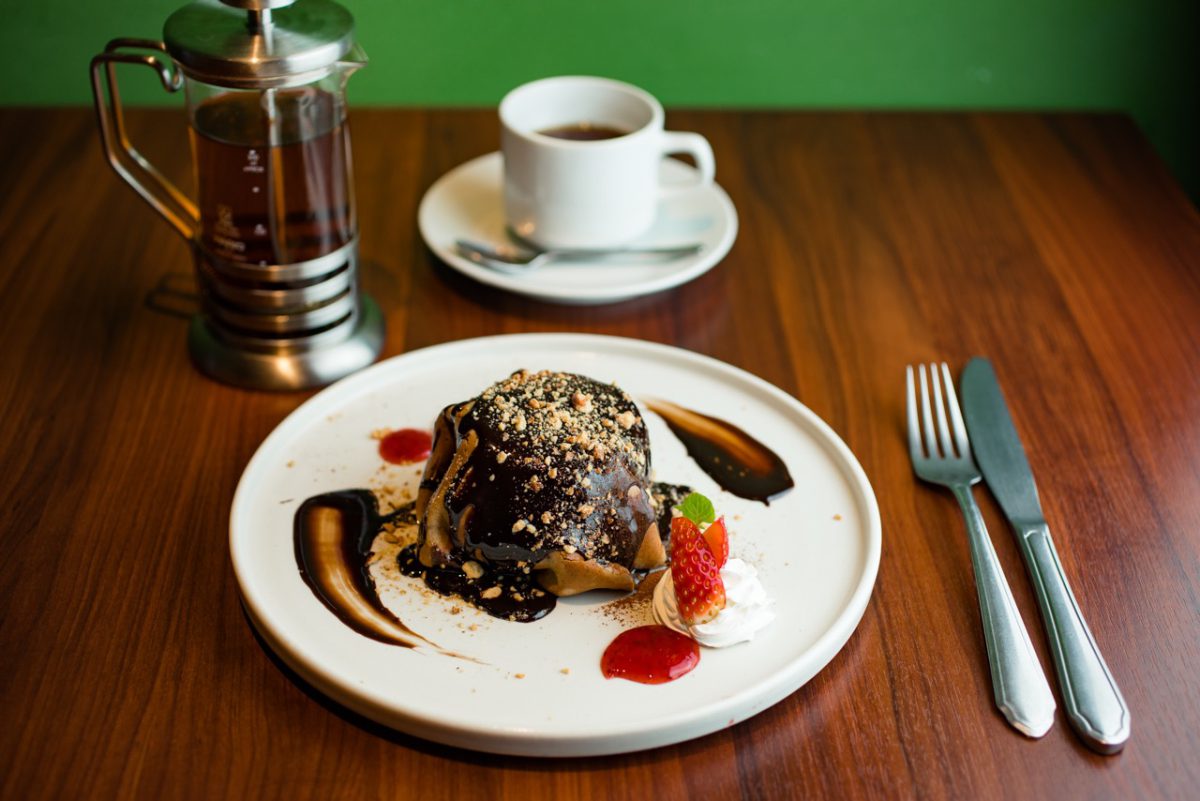 ハンバーグ、シチューなど、昔から愛される洋食を提供するレストラン。手の込んだ料理に定評があるが、実はスイーツメニューも高クオリティで見逃せない! 今年のバレンタインのために特別に作られたのが「チョコレートづくしのチョコレートケーキ」。チョコレートケーキ、ホイップクリームをクレープで包み込み、チョコレートソースとカリカリのナッツ、いちごジャムでデコレーションした、アイディア満載の1品。数量限定なのでお早めに。