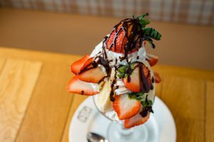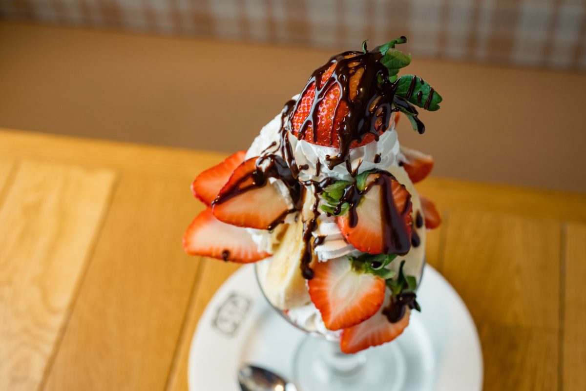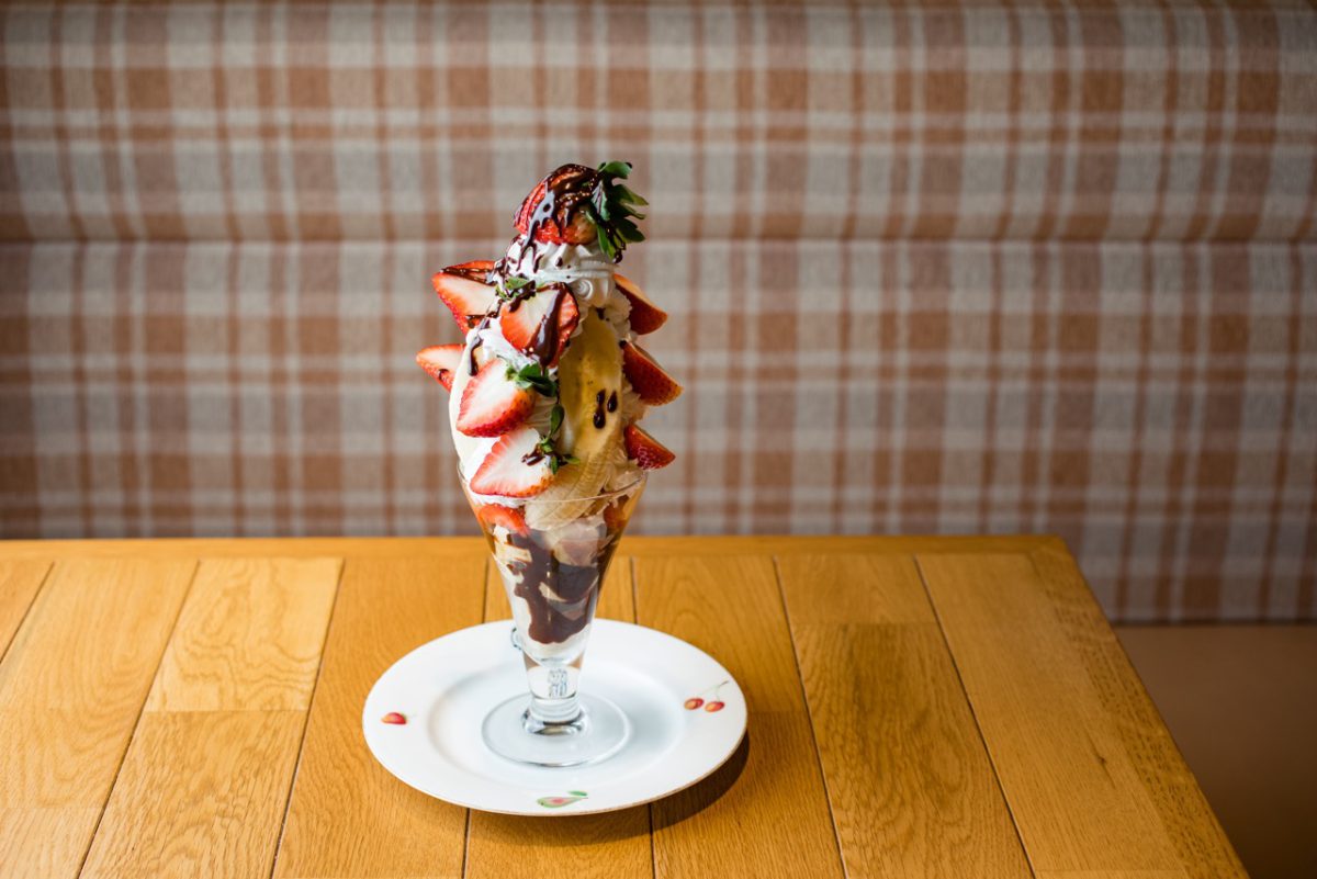 旬のフルーツの味わいを生かしたスイーツを提供する、人気フルーツパーラー。フルーツの旬に合わせて、季節限定メニューが続々登場し、今冬イチオシは「いちごチョコバナナパフェ」。その時に一番美味しいイチゴとバナナをふんだんに使用し、甘さ控えめの生クリームと、ビター感の強いチョコレートソースと合わせている。食べ進めていくと、なかにはチョコレート、ストロベリー、バニラの3種類のアイスが! フルーツにアイスやソースを絡めながら食べるのがおすすめ。