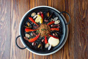 スペイン海岸地方の魚介料理をメインとしたバル。日本全国の漁港から水揚げされた海の幸を使ったスペイン料理が揃い、中でもパエリャは誰もが必ず注文するテッパンメニュー。魚介、オマールエビ、渡りガニなど様々な種類が揃う中、イチオシは「イカ墨のパエリャ」。魚介のエキスと濃厚なイカ墨を合わせた特製スープで生米を炊き上げることで、魚介の濃厚な旨味をしっかりと閉じ込めている。アサリ、ムール貝、イカなど具もたっぷりのっており、魚介のおいしさを存分に楽しめる。