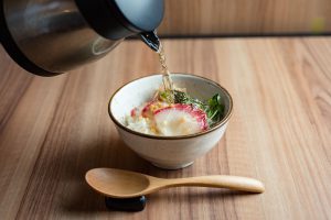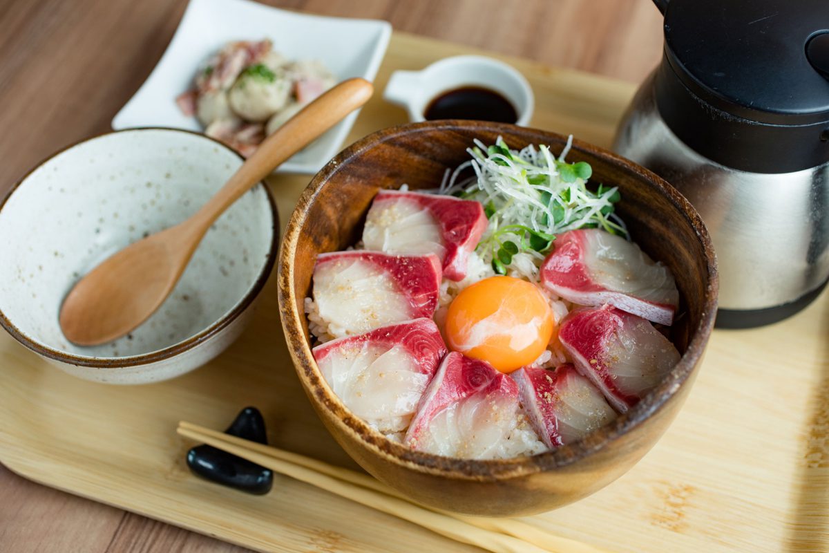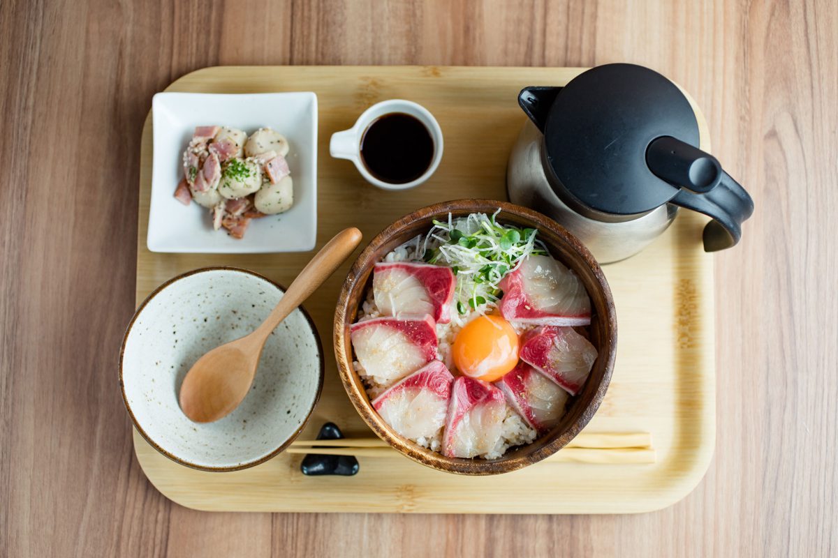 こだわりの特製お出汁が自慢の創作だし茶漬け専門店。まずは丼として、次にお出汁をかけてお茶漬けとして楽しめる「おひつごはん」と、野菜を使った和のおかずとお茶漬けの具が選べる「お茶漬けご膳」目当てで連日大人気。おひつごはんは、海鮮系からお肉系まで12種類の定番のほか、季節限定も。冬限定の「ぶりのあつめしおひつごはん」は、冬に旬を迎えるぶりを醤油のタレに漬け込み、ご飯にのせた大分の郷土料理をアレンジしたもの。ここでは特製のごま醤油タレに漬け込んでいるため、ぶりのとろける味わいとごまの風味が絶妙にマッチ。