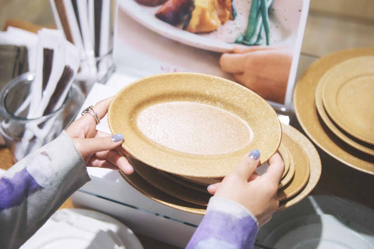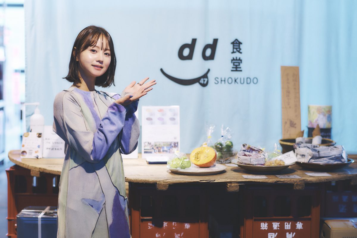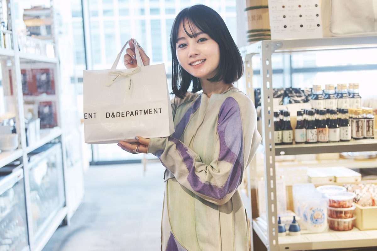 「〈d47食堂〉は、プライベートでランチやカフェを利用したことがあります。店頭のショップがずっと気になっていて、いつかゆっくりお買い物したいと思っていたので、今回来られてうれしいです」とNANAMIさん。ここは47都道府県の「食」をテーマに、作り手の想いを伝えるショップ&レストラン。提供している料理に使用している全国各地の食材や調味料、食器などをショップで販売している。