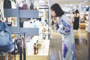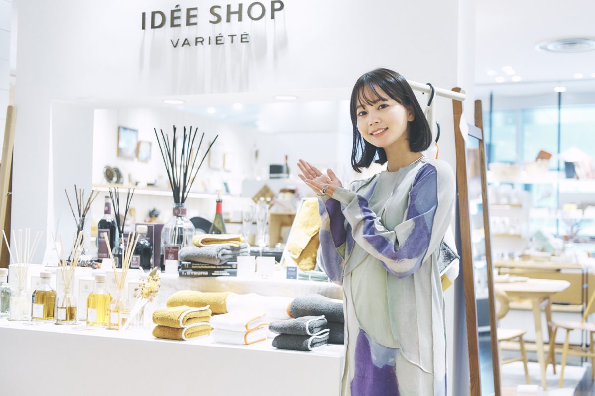まずは5Fの〈IDÉE SHOP VARIÉTÉ(イデーショップ ヴァリエテ)〉からお買い物開始! こちらは、オリジナルデザインの家具やインテリア雑貨を取り扱う〈IDÉE SHOP〉のコンパクトショップ。国内外からセレクトしたフレグランス、ファブリック、アパレルグッズ、アートなど、生活に彩りと癒しを与えるアイテムが充実しています。