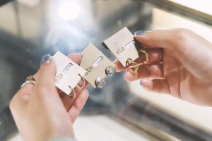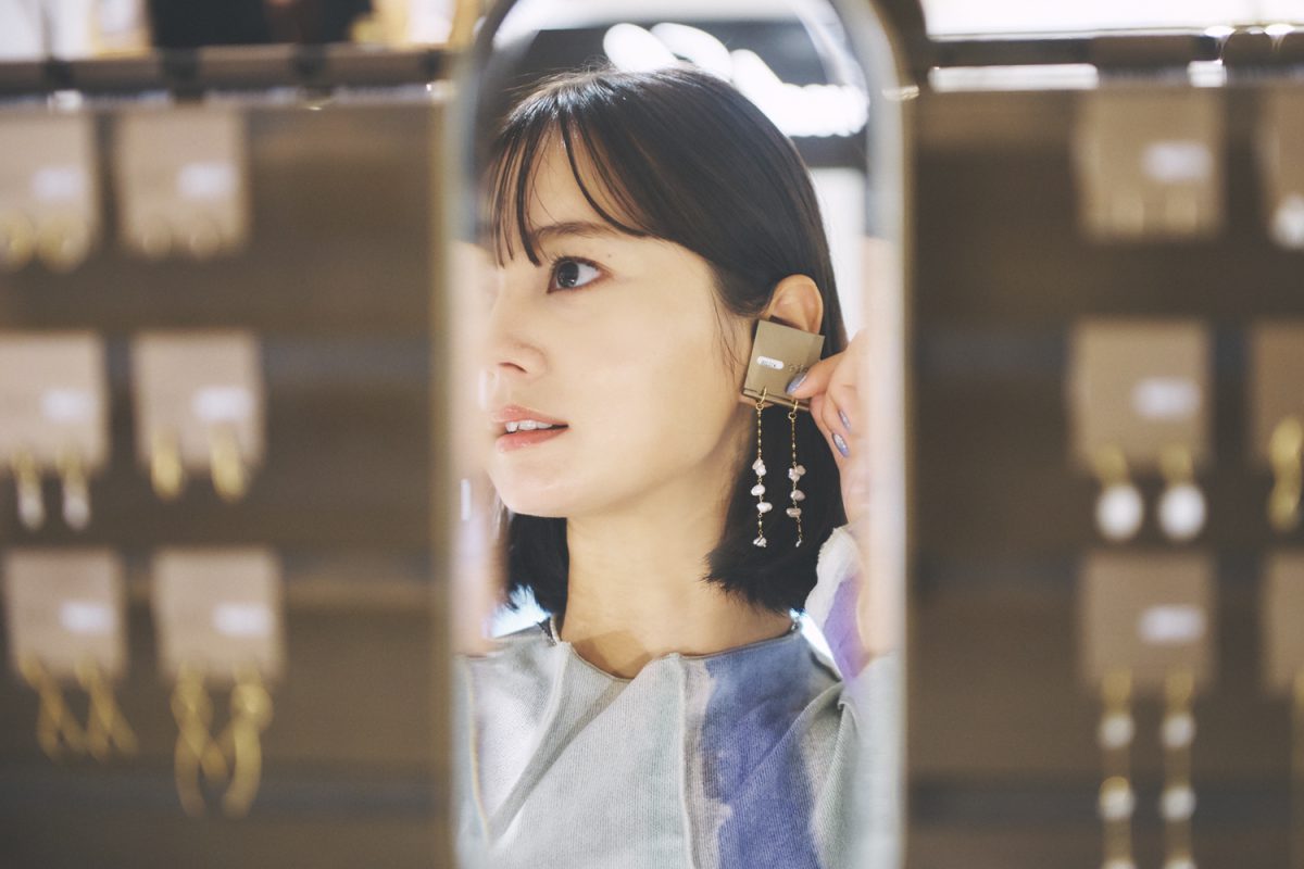 店内を巡りながら、1点1点じっくりジュエリーを見つめる眼差しは真剣そのもの! 「今年の誕生日プレゼントはピアスにしようかな。今まではボリューム感のある大ぶりなデザインのものを身に着けることが多かったのですが、今年で28歳になるし、新しい自分と出会うためにも、シンプルでクラフト感のある、このピアスにします」
