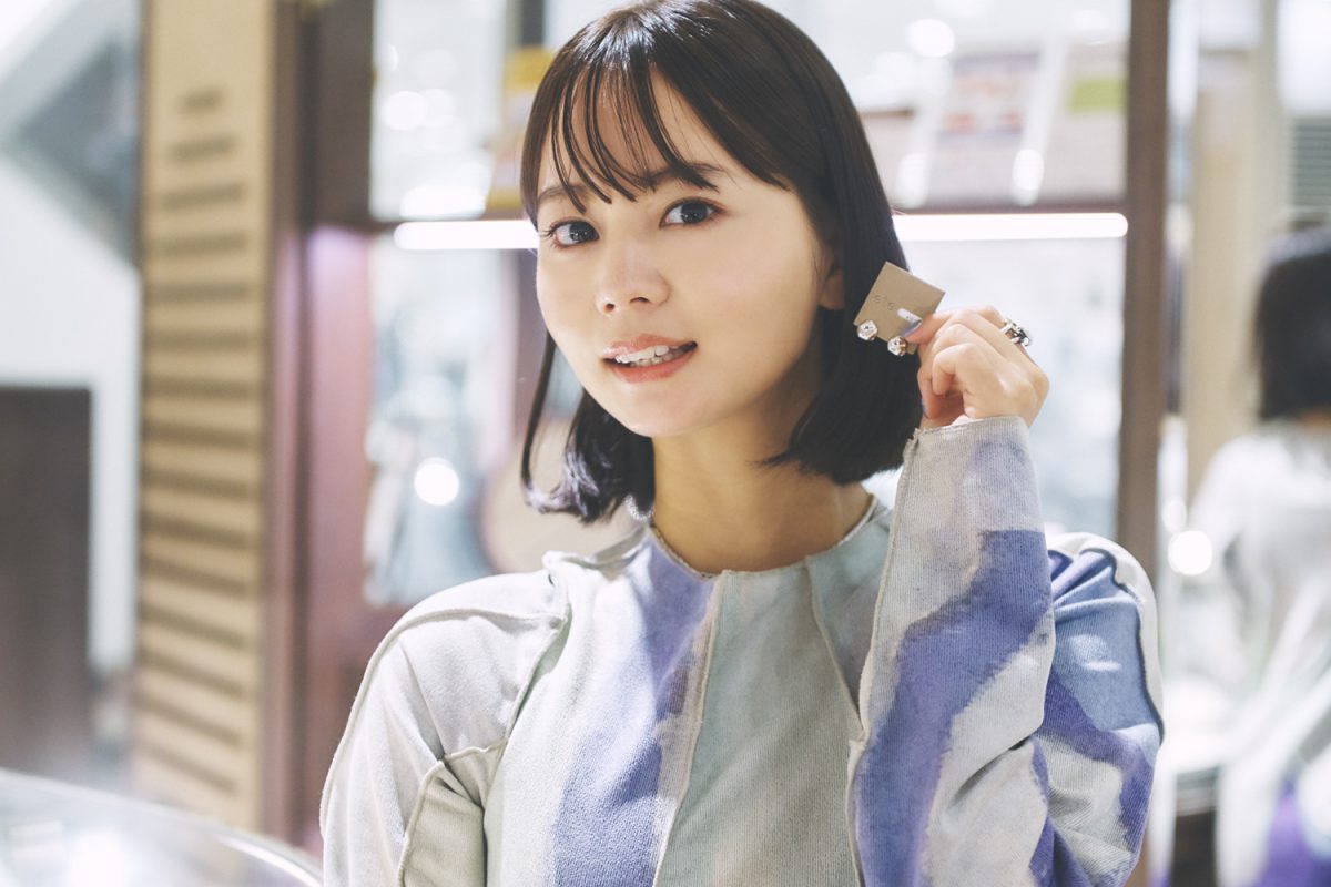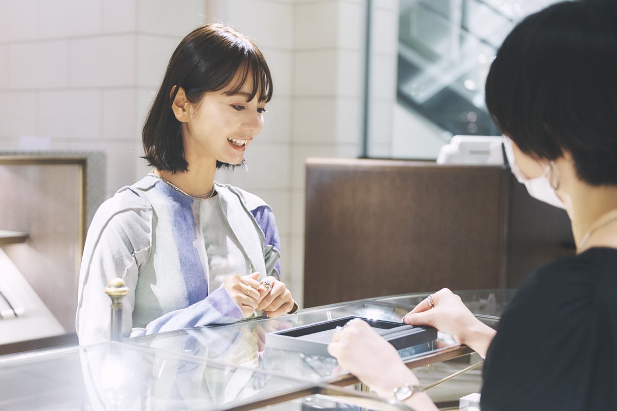 NANAMIさん自身もアクセサリーが大好きで、今回身に着けているリングやネックレスも全て私物。「今日の洋服に合わせて自分で選びました。アクセサリーを身に着けると気持ちが引き締まります。でも、ピアスはいつの間にかなくなっていることが多くて…。10月は誕生月なので、誕生日プレゼントに自分へジュエリーを贈ろうと思います」。と、〈ete〉では自分用のギフトを探すことに。
