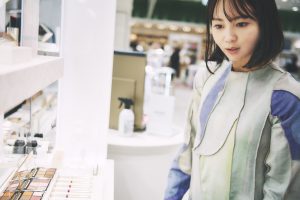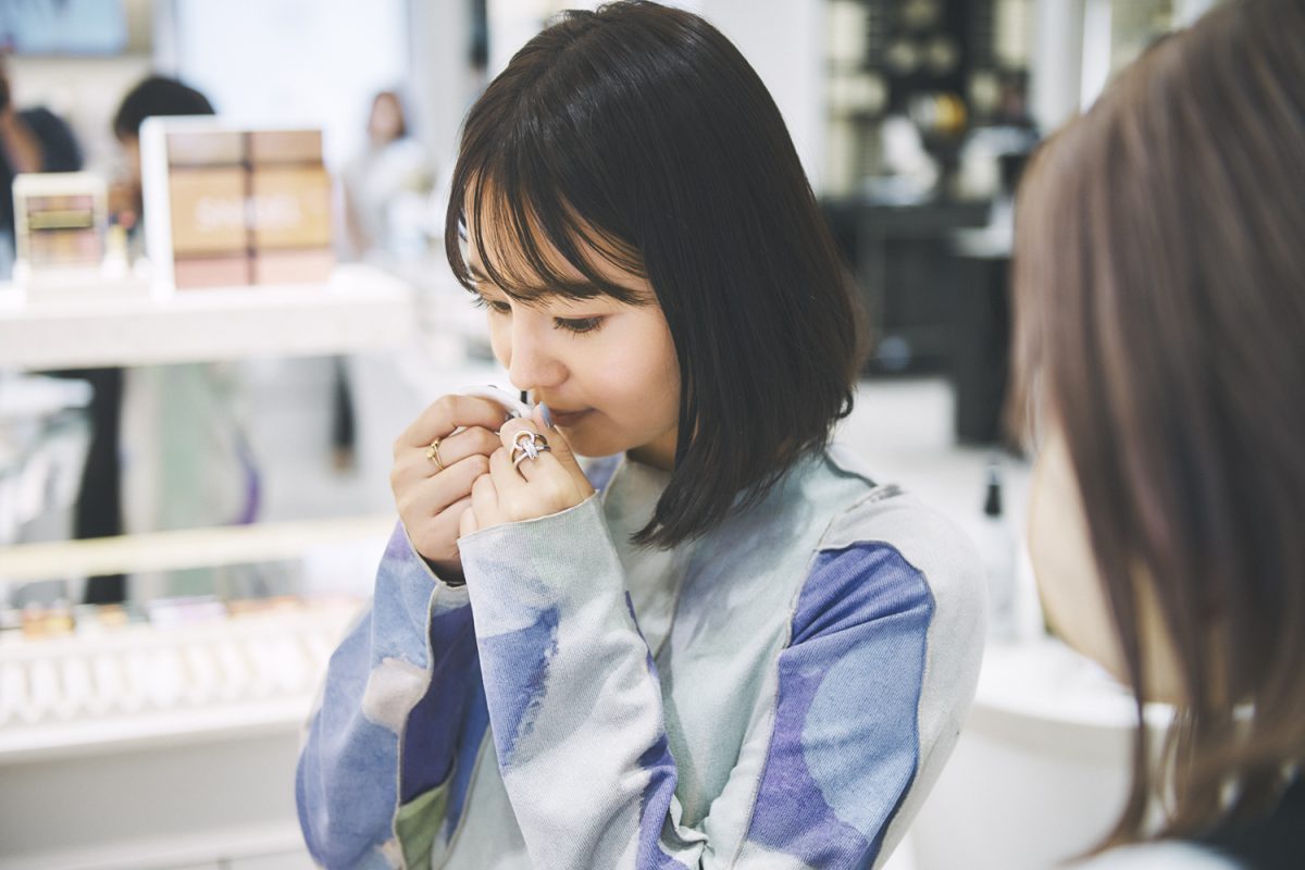 「私もアイシャドウを愛用しています。発色が良くて気に入っています」とNANAMIさん。ここでは、いつも影で支えてくれて、今回の買い物にも同行しているマネージャーさんに、日頃の感謝を込めてギフト探し。「メイクアイテムは、人それぞれ色味のこだわりがあるから、誰かに贈るなら幅広く使えるハイライトや、基礎化粧品など実用性があるものがいいですよね」。そこでスキンケアラインの中からNANAMIさんが選んだのは、「アロマティック モイスチャーミスト」。「メイクの上から使えるミスト化粧水なので、乾燥対策はもちろん、気分転換にもなるので、バッグに1本忍ばせておくと便利に使えるアイテムです」