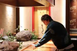 すごく落ち着きましたね。うなぎ屋さんと聞いて、なぜか勝手に座敷のイメージがありましたが、そういうわけでもなく、渋谷で食べるうなぎ屋さんというところの“綺麗さ”みたいなものも大事にしつつ、店内には枯山水のような和の要素もあって、素敵だなと思いました。中でも個人的に一番素敵だなと思ったのは、職人さんが料理されているところを見られることですね。僕はお店の雰囲気としてすごく良いなと思いました。
