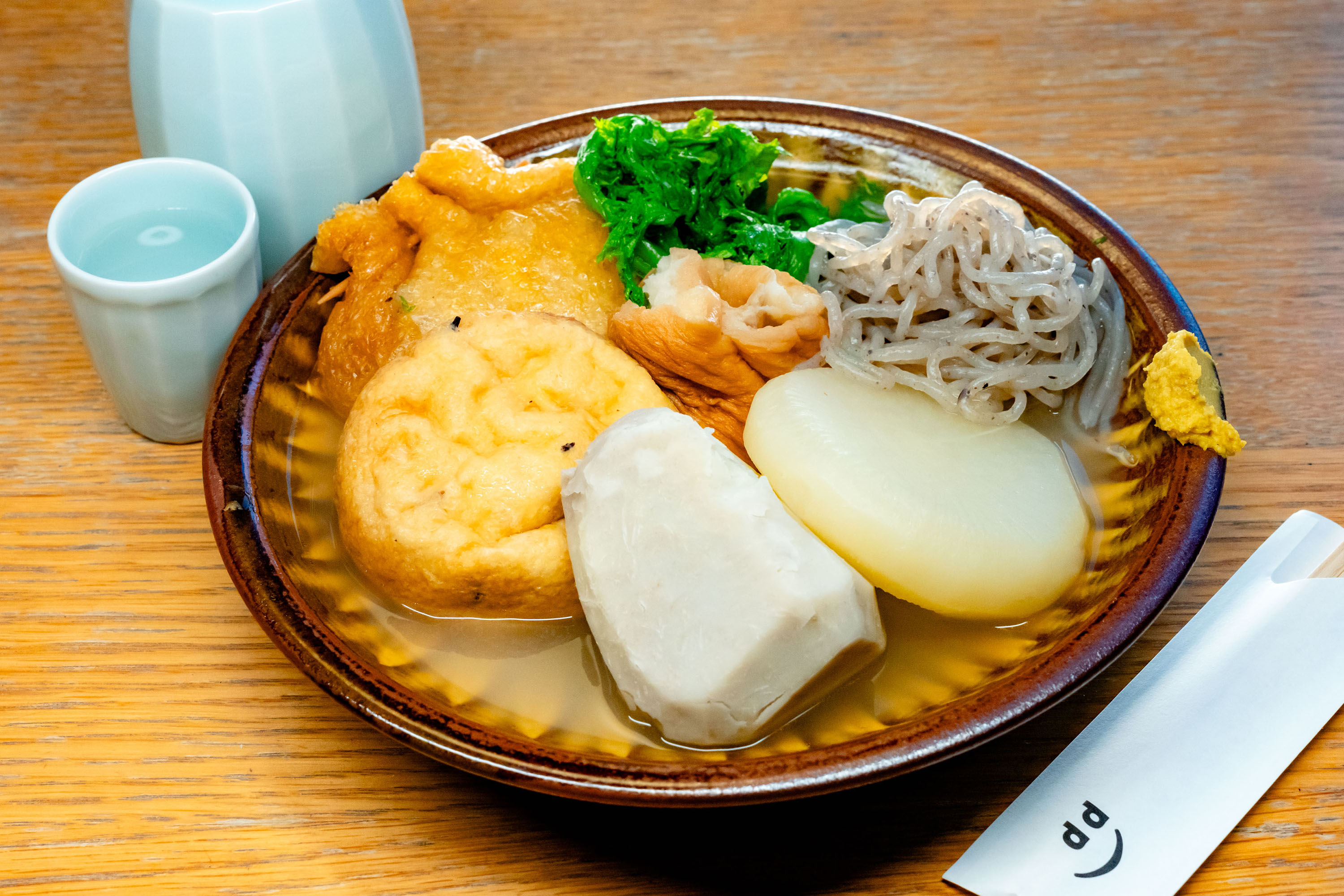 良質ないりこを使った深みのある出汁に、d47食堂特製の「白だしつゆ」で仕上げたおでん。お好みの具材を、一つから自由に選べる。