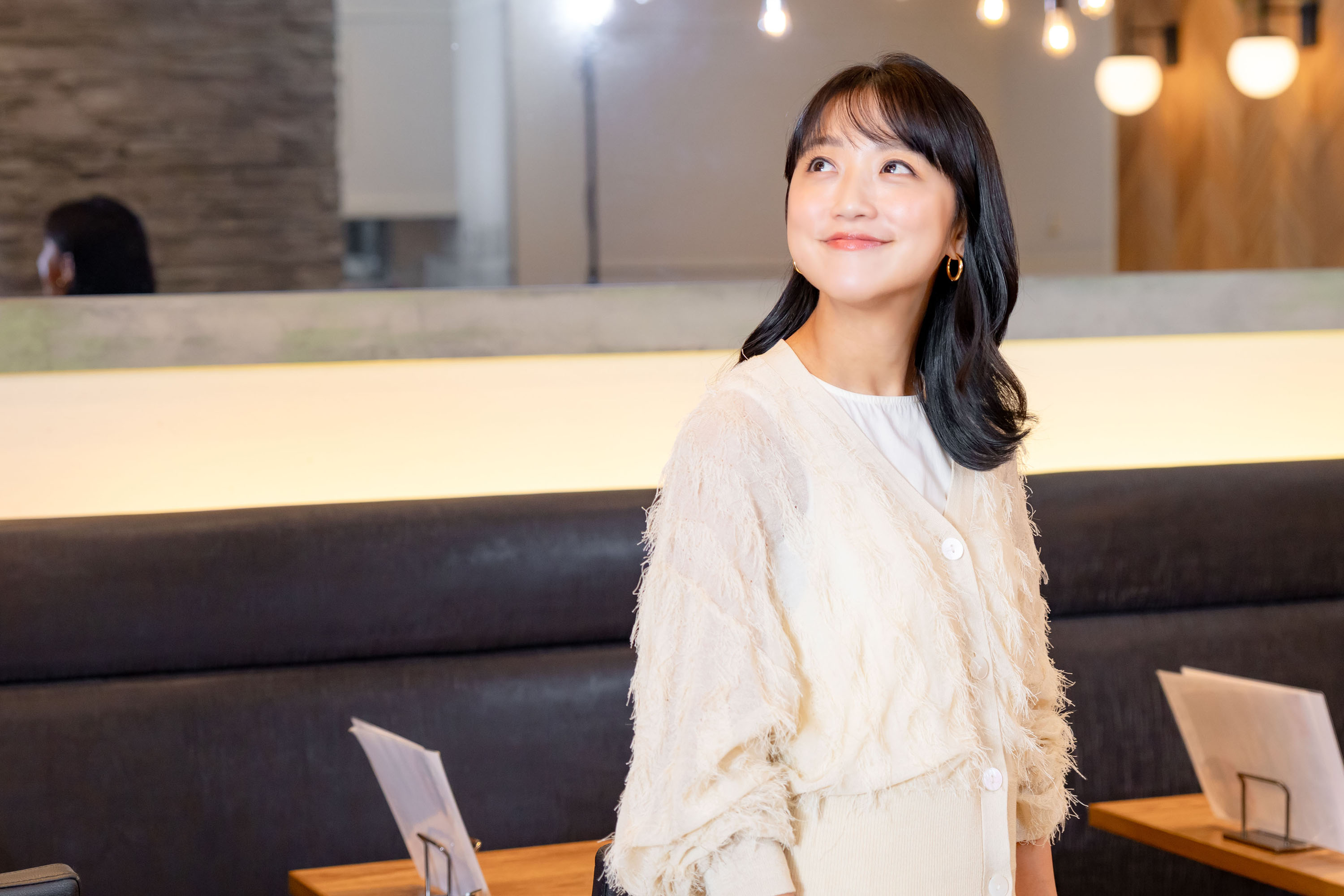カーディガン13,200円、ワンピース16,500円(テント/A・Plus 06-6210-5898) ピアス14,300円(ヴァンドームブティック/ヴァンドームブティック 日本橋三越本店 03-3270-0165)