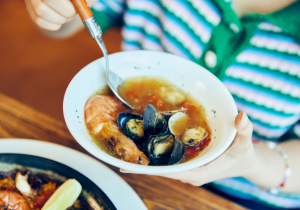 つづいてメインのパエリャが登場。食欲をそそるいい香りに「上がりますね!」とサーヤさん。パエリャは好物でいろいろ食べているそうですが…。