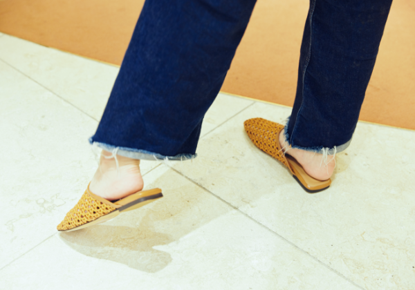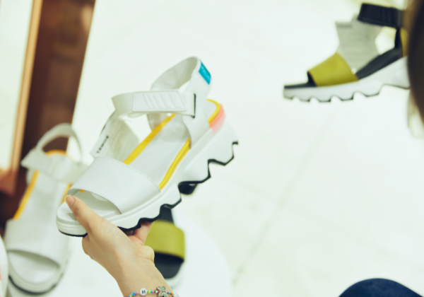 ということで、国内外のブランドが揃うシューズショップ〈ShinQs シューズ カレイド〉へ。お目当ては、脱ぎ履きがラクで涼しいサンダル。「いい感じのサンダルがたくさんある!」とサーヤさんは前のめりに。いろいろ手に取って履いてみて、値段を見ながら計算しているご様子。そして検討した結果、「やっぱり、今回はサンダルは諦めます。いろいろチェックできたからイメージができました!」