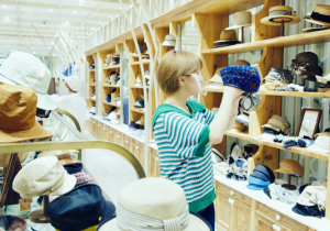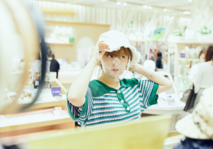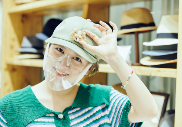 サーヤさんはキャップやベレー帽、ニット帽など、ちょっとハードルが高い個性的な帽子を選んで次々に試着。どれもお似合いで、自然に着こなしているのはさすが! そのなかで、白いバケットハットを何度もかぶって値段を確認して…、お買い上げ決定。
