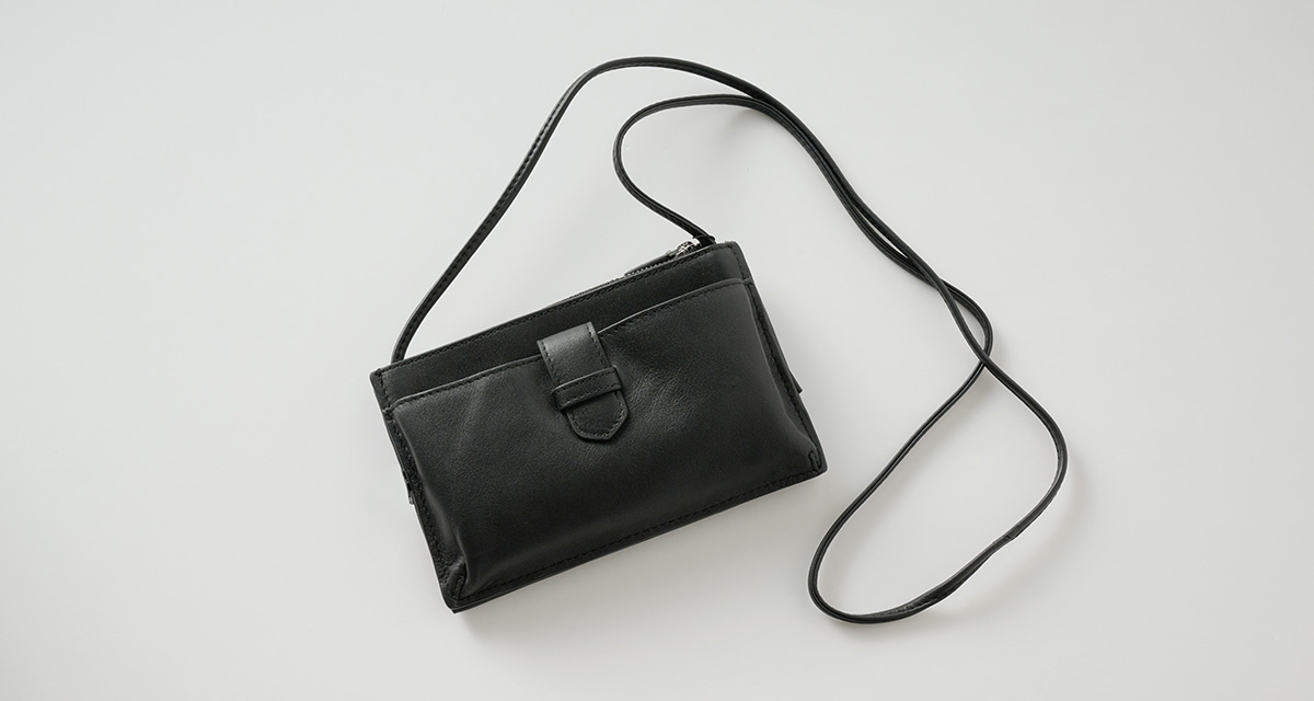 横長タイプのお財布とスマホケースを兼ね備えたレザー素材のショルダーバッグ。スタイリッシュな見た目に関わらず、収納力は抜群です。