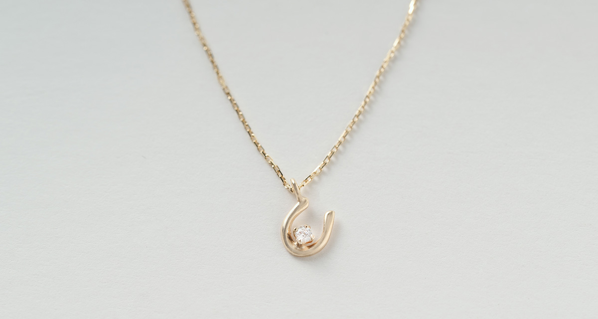 馬のひづめにつけるU字の金具で、開いた部分から幸せが入ってくると言われる“ホースシュー”に、さりげないビジューをプラス。華奢なデザインでデコルテをきれいに見せてくれます。
