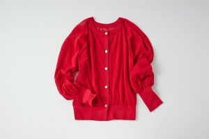 表はボタンを外してトップスとレイヤードしたり、裏はパンツにインしてさらっと着たり、チェンジして楽しめる。程良いシアー感と旬の赤で女性らしさを演出。
