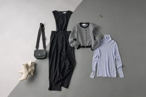 幾何学模様のニットをメインに、同じくトレンドのモノトーンでまとめて女性らしく。素材違いの小物でさりげない遊び心も忘れずに。