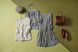 ツイードベストの着回し2体目。流行色のグレーのセットアップは、簡単に上品に仕上がる必須アイテム。