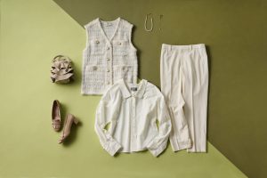 ツイードベストの着回し1体目。ベストの白をベースに、ベージュを散りばめたワントーンでリッチな着こなし。