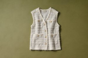 服だけでなく、バッグや靴などの小物にも取り入れられているツイード。ベストはジレ感覚で羽織ればカジュアルになるし、デニムとも相性ばっちり。「ツイードのベストに合わせたワントーンコーデは、色を揃えるだけで簡単ですし、上級者見えが叶います」(後藤さん)。