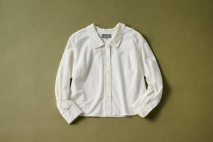 コットンとウールを混ぜた、肌触りのいいポプリンシャツ地を使用。ラウンドカラーを通常より低めにしてルーズな印象に、クロップド丈で個性をプラス。