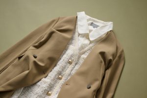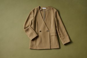 コートを合わせるなら、ノーカラージャケットで軽やかに。軽量でシワになりにくい素材だから、持ち運びも便利。