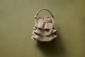 大ぶりのフリルが個性的なミニバッグは、ベージュで大人っぽく。取り外し可能なショルダーストラップ付き。