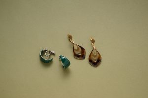 大きめのデザインで顔まわりを華やかに。コーディネートの差し色にするならグリーン、トーンを揃えるならブラウンを選んで。