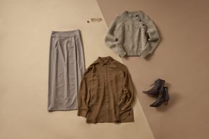 今季はニットが大豊作。中でも、クラシカルテイストに合わせるならベーシックニットをチェックして。「ドネガルニットはツイードが混ざっているようにも見える、一枚あれば高見えするアイテム。素材違いのタイトスカートを合わせつつ、全体の色味を揃えれば上品にまとまります」(後藤さん)。