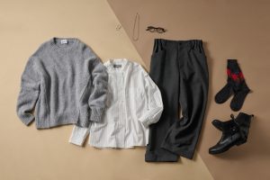 フラフィーニットにスタンドカラーシャツ、ワイドパンツと、ベーシックカラーで統一。足元のショートブーツでゆるっとしたシルエットを引き締め。