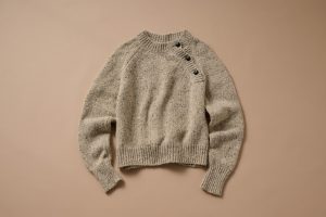 ツイードのようなムラのある素材がおしゃれなドネガルウールを使用。チャンキーでハンドメイドを彷彿させるニットは、ラグランのボタンでひとクセあり。