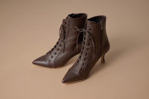 こっくりブラウンのショートブーツは、華奢なラインとヒールで女性らしさを忘れずに。
