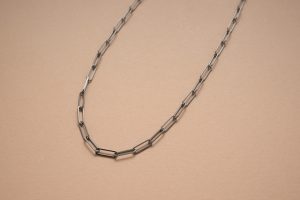ツヤのあるブラックカラーがシックな印象に。縦長のコマをつなぎ合わせたチェーン。そのままはもちろん、重ね付けも楽しめる。
