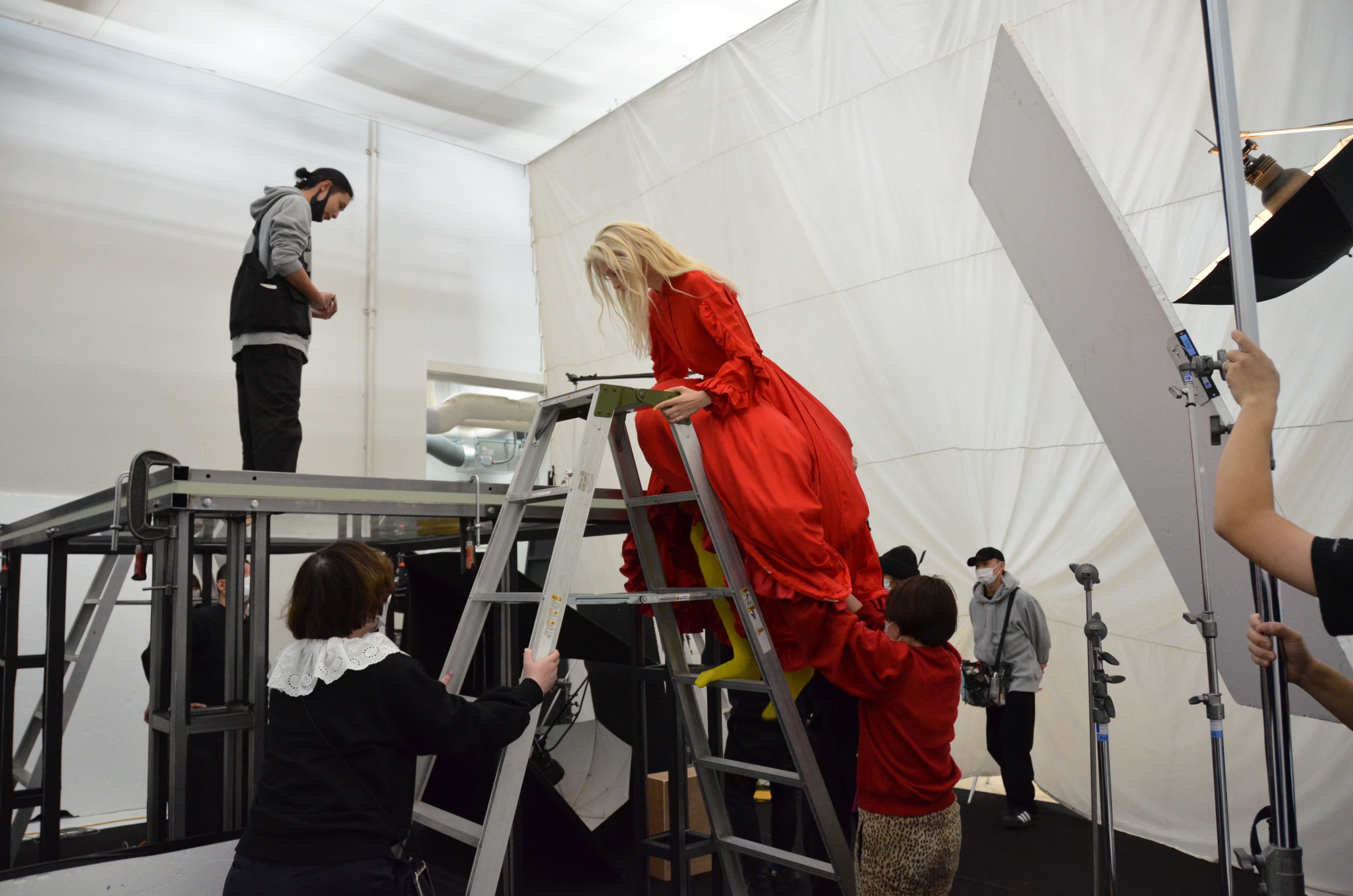 掛け声とともに、颯爽と現れたモデルのSUMMERさん。おもむろに、脚立を使ってアクリル板の上に登っていきます。下ではカメラマンがスタンバイ。