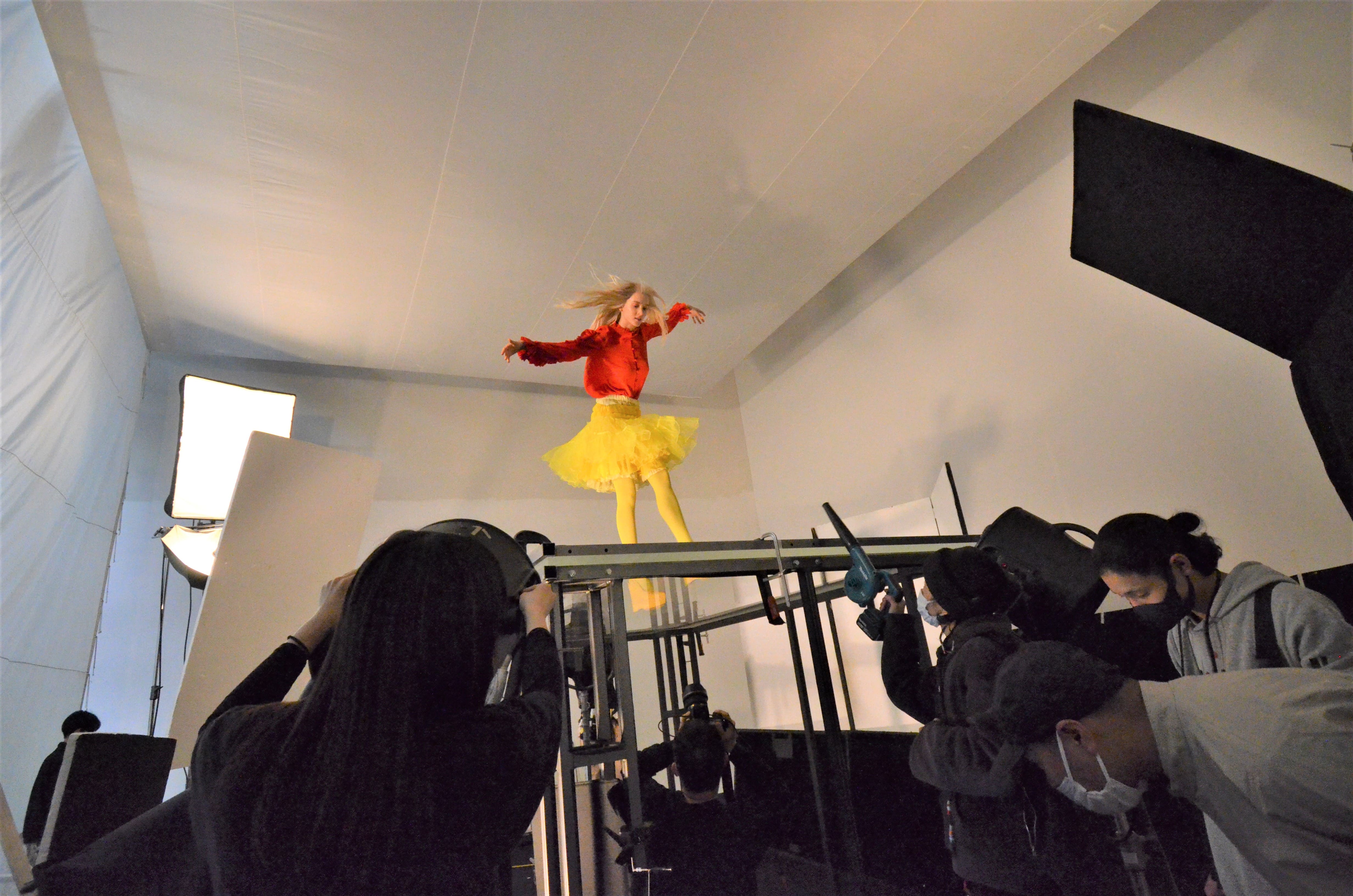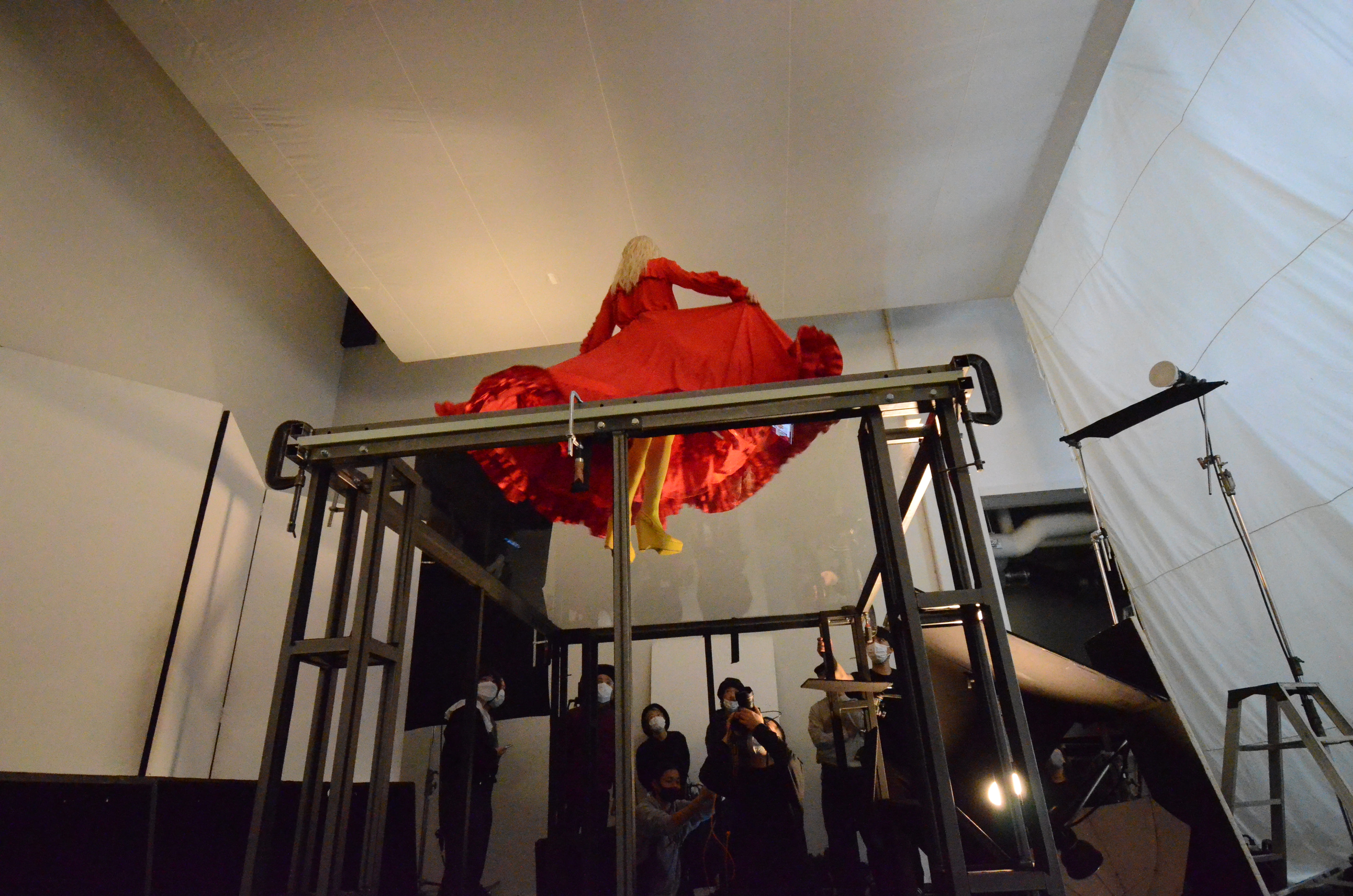 「スカートの裾を持ってから回ってみよう!」「今のいいね!花が咲いているように見えるよ。」 撮影のディレクションを担当したのは、アートディレクター(以下AD)の大島慶一郎さん。上で踊るSUMMERさんと、下に置かれたモニターに、交互に目を光らせながら指示をしていきます。