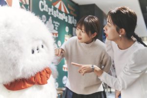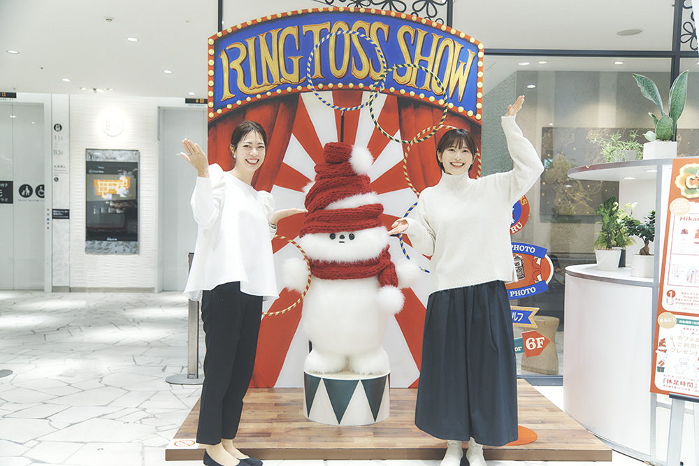最初に訪れたのは、B1にある〈グルル〉のグルグル輪投げショー。初めてのエルフとの対面に大興奮のお二人。「写真で見て想像していたよりも、モフモフしてる!」(風間さん)、「グルグル巻きのマフラーを取ってみたら、どんな頭になってるんだろう(笑)」(大木さん)と、ふたりとも興味津々です。