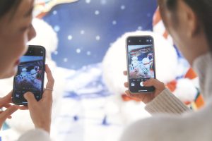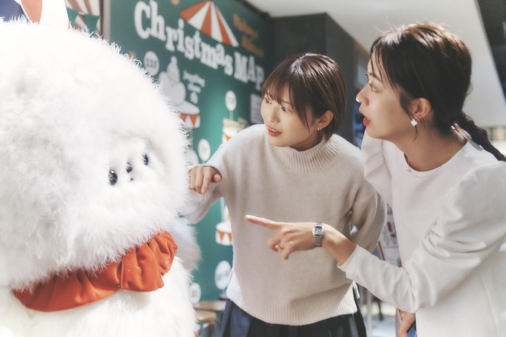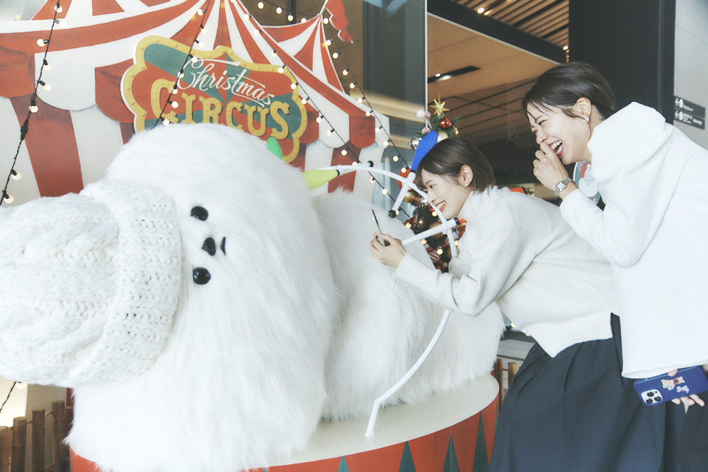 最後は11Fにある、〈ホッペ〉の寝ながらジャグリングショーへ。食いしんぼうで力持ちの〈ホッペ〉の大きさに二人ともびっくり。「ほっぺの中に何が入ってるんだろう!」と想像しながら、思わず近くでもパシャリ。「実際に会いに行ってみると、エルフごとに毛並みが違ったり尻尾が可愛かったり発見と驚きの連続。お気に入りのエルフを探しながら巡ることができました」(大木さん)。「天井やクリスマスツリーにもHikariELFがいて、お買い物をしながら隠れエルフ探しも楽しそうです!」(風間さん)