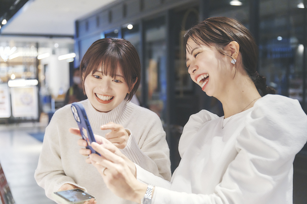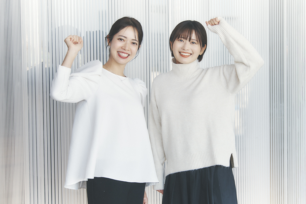 美容インフルエンサーで二児の母でもある大木南さん(左)と、バリスタやモデルなど多方面で活躍する風間夏実さん(右)。二人とも渋谷ヒカリエには色々なシーンで訪れるそう。この日はHikariELFになりきって(!)リンクコーデで体験してくれました。