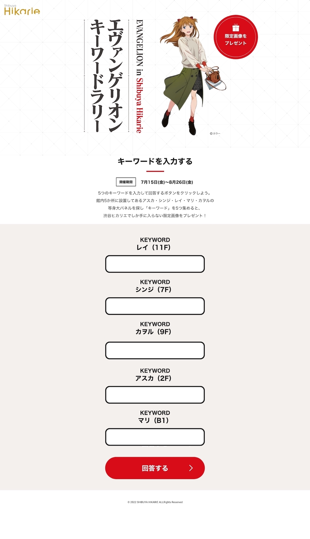 館内5ヶ所に、私服でショッピングを楽しむアスカ・シンジ・レイ・マリ・カヲルの等身大パネルが設置されています。パネル付近にある「キーワード」を探し出してください。