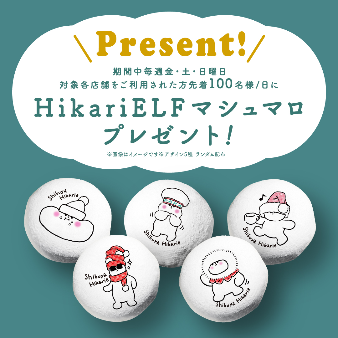 また、12月1日(木)~25日(日)のフェア期間中、毎週金・土・日曜日に対象店舗を利用された各日先着100名様(各店ごと)には、渋谷ヒカリエ限定 HikariELFマシュマロ(デザイン全5種から1種ランダム)をプレゼント!