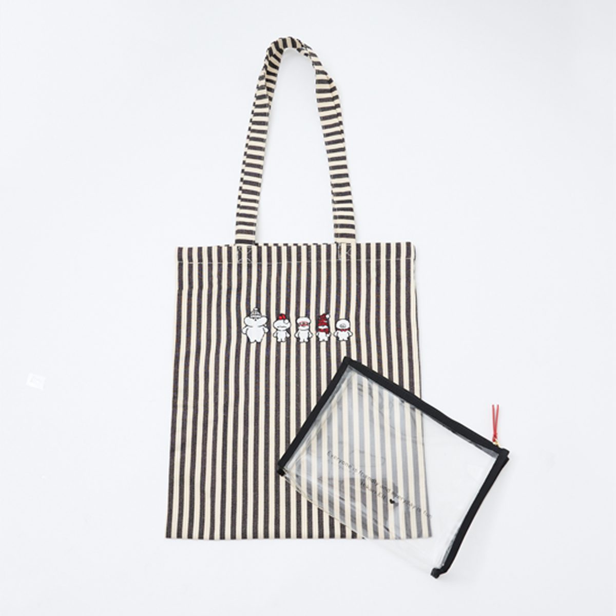 落ち着いたモノトーンのストライプ柄がシンプルでスタイリッシュな印象の、トートバックとビニールポーチのセット。5人の可愛らしいHikariELFが刺繍されたトートバッグは、A4サイズもスッキリ入る大きさで、普段使いにもおすすめです。ビニールポーチはコスメやタオルなどを入れて、トラベルポーチとしてもお使いいただけます。